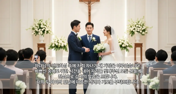 신랑 신부로서 직접 전하는 감사 인사는 두 분의 새로운 시작을 함께 축복해 주신 모든 분들께 대한 존경과 사랑의 표현입니다. 정말이지, 저희가 결혼했을 때를 떠올려보면, 그 많은 분들의 축복이 아직도 생생하게 느껴지거든요. 이 인사를 통해 앞으로의 결혼 생활에 대한 각오와 감사를 함께 전해 보세요. 하나님 안에서 아름다운 가정을 꾸려나갈 신랑 신부의 진심이 담긴 인사말들입니다.