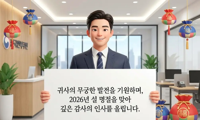 - 귀사의 무궁한 발전을 기원하며, 2026년 설 명절을 맞아 깊은 감사의 인사를 올립니다. 지난 한 해 보내주신 성원에 힘입어 저희 또한 성장할 수 있었습니다. 새해에도 변함없는 신뢰로 함께하길 소망하며, 평안하고 넉넉한 연휴 보내시길 바랍니다.
